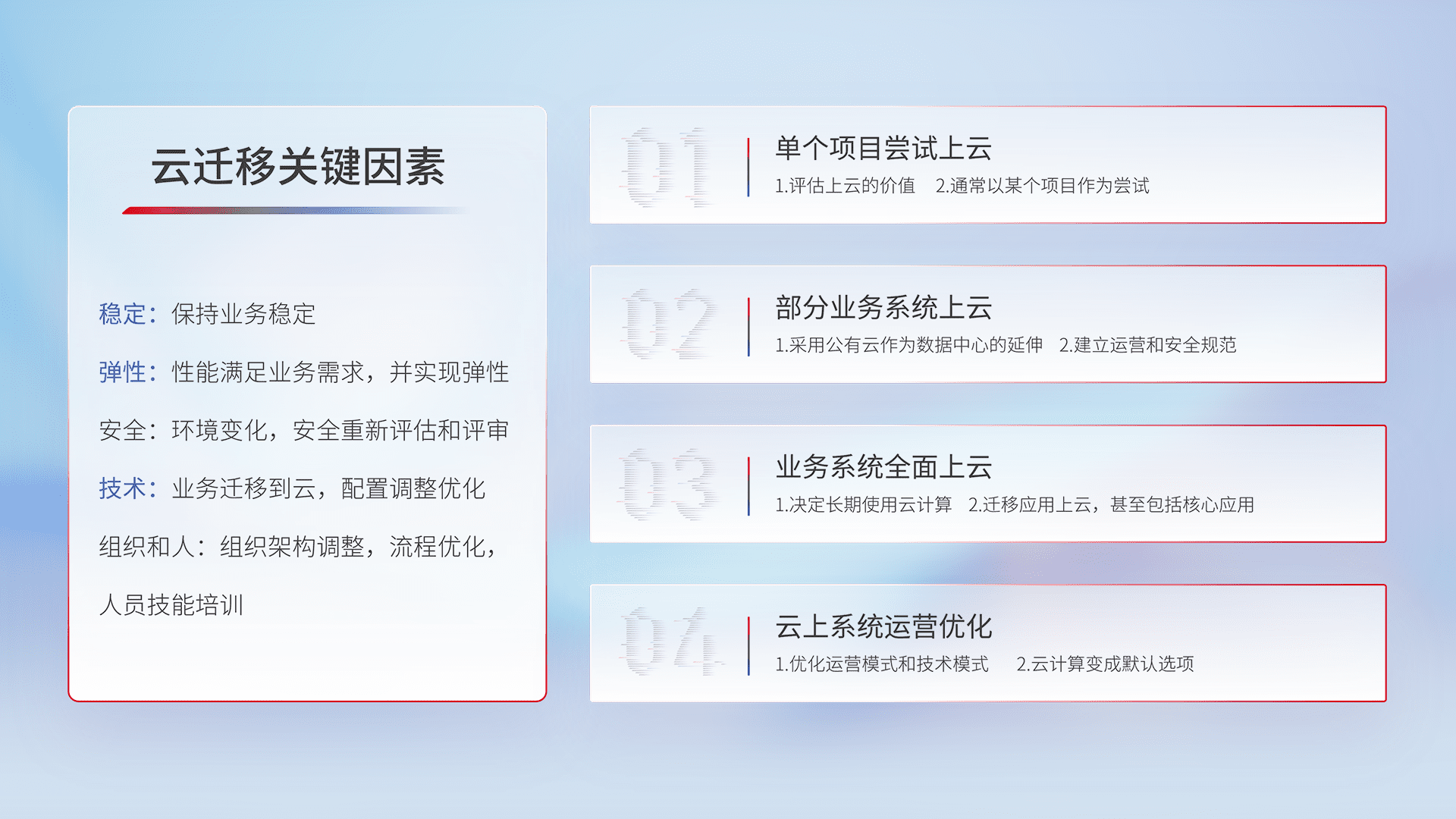 结合实际业务,,从规划设计、、、云平台选型、、、、云原生改造、、数据迁移、、、集成交付,,迁移全过程为客户识别最佳上云路径,,做好风险识别管理,,,设计网络架构、、、、身份权限、、、安全审计合规、、、操作审计、、、日志审计、、监控告警策略、、、、多站点容灾设计等,,,对云上基础设施进行整体规划,,,,提升IT治理水平,,,以满足弹性、、、、高可用、、、、高性能的需求。。