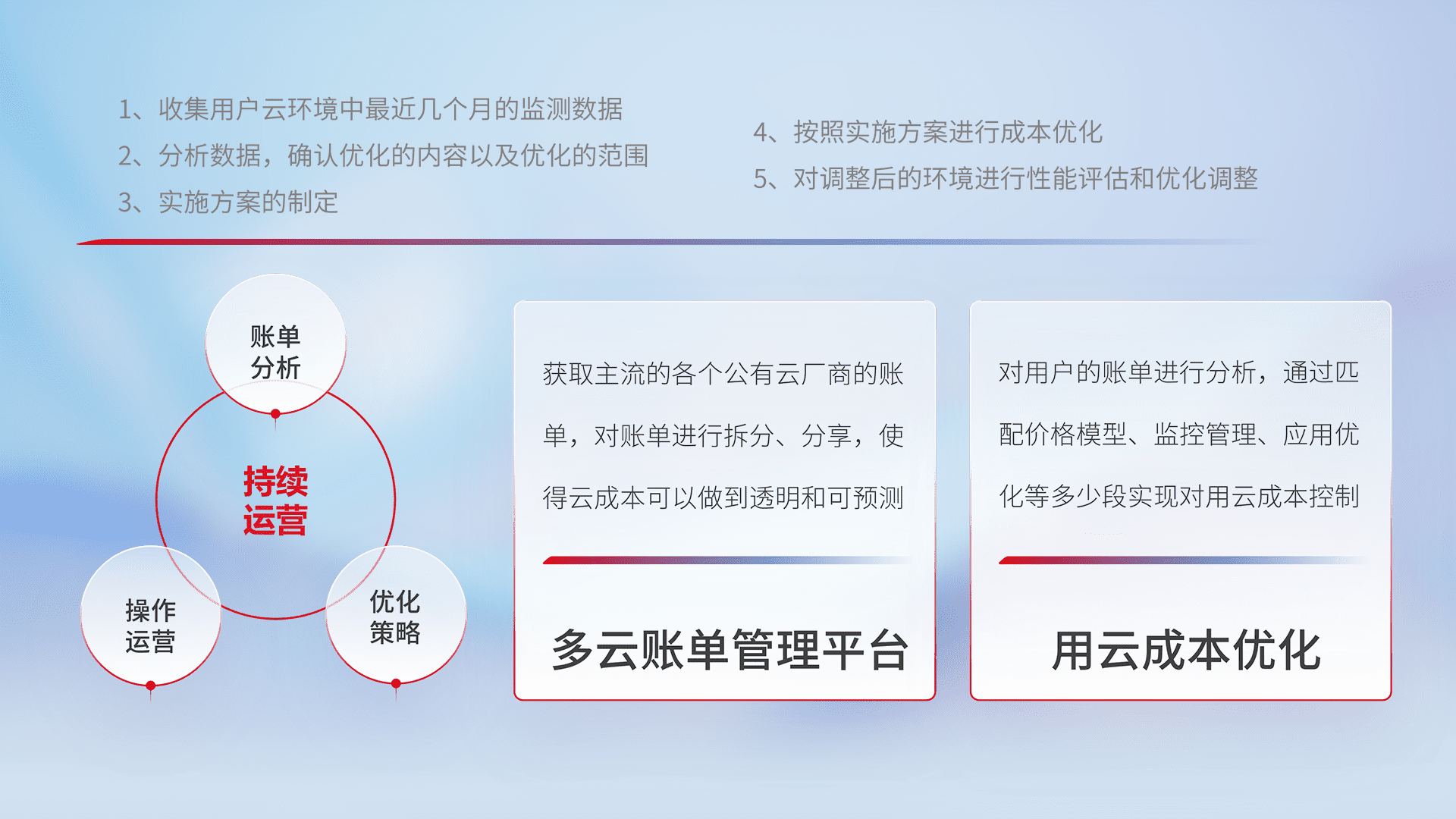 通过多云纳管,,,,以统一的资源数据模型把客户的云资源进行抽象和封装,,,进而实现对多云资源的统一操作,,保障云资源管理的可靠性、、、稳定性与可用性。。。。量身定制化运维内容,,配置、、、、开发运维、、补丁管理、、、备份、、、监控、、、认证和访问管理、、、、审计和日常巡检等,,,,保障在用云过程中的可靠度,,,,稳定度以及高可用率。。